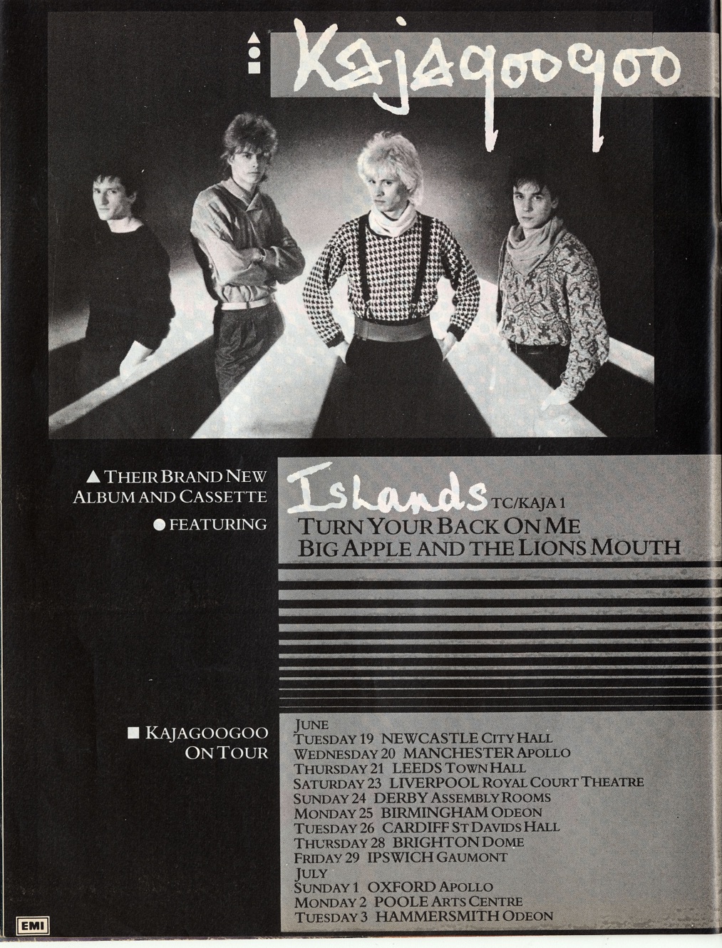 Funny seeing the Islands Tour dates. I was very sick off and on that summer (long story) I think I had to cancel a lot of gallivanting around, I certainly dont remember much about those couple of months in general although I am sure i went (or at least had arranged!) london, oxford, birmingham and brighton. I must have gone to some, I have a dim recollection of the support band called (I think) National Pastime and that I couldnt quite get used to seeing them onstage without Limahl, some of the dynamic was gone.