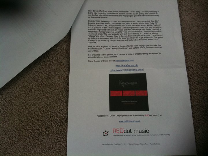 The press release is a two page document, also in colour. It documents all the key facts about the single and gives information that the DJ can read out when introducing the single. This press release is available from KajaFax and the Official Kajagoogoo Website.
