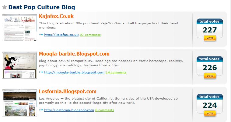 After a spell back down the rankings, I’m delighted to say that we’re back at the top of the ‘Pop Culture’ category in the Bloggers Choice Awards 2011.