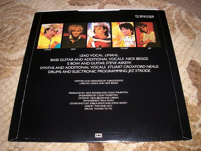 The album, White Feathers was recorded over Christmas ’82 and the band made their first TV appearance on The Other Side of the Tracks in January ’83.  A week later Too Shy made the number one slot.  Here we have the 12” version of that release proudly displaying the famous Kajagoogoo logo still in use by the group to this day:
