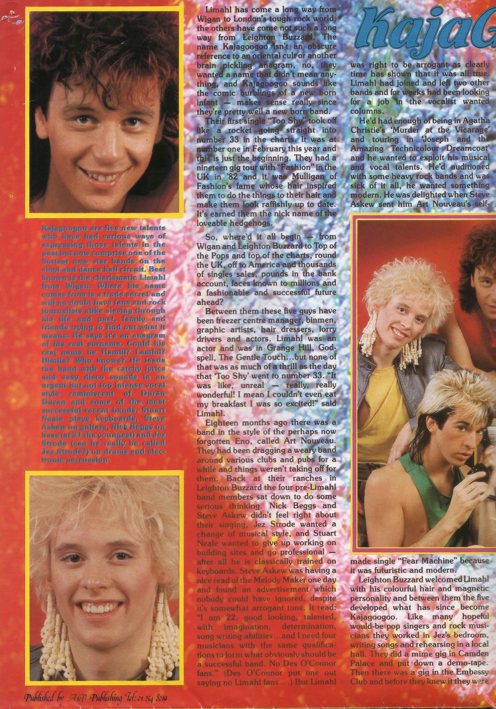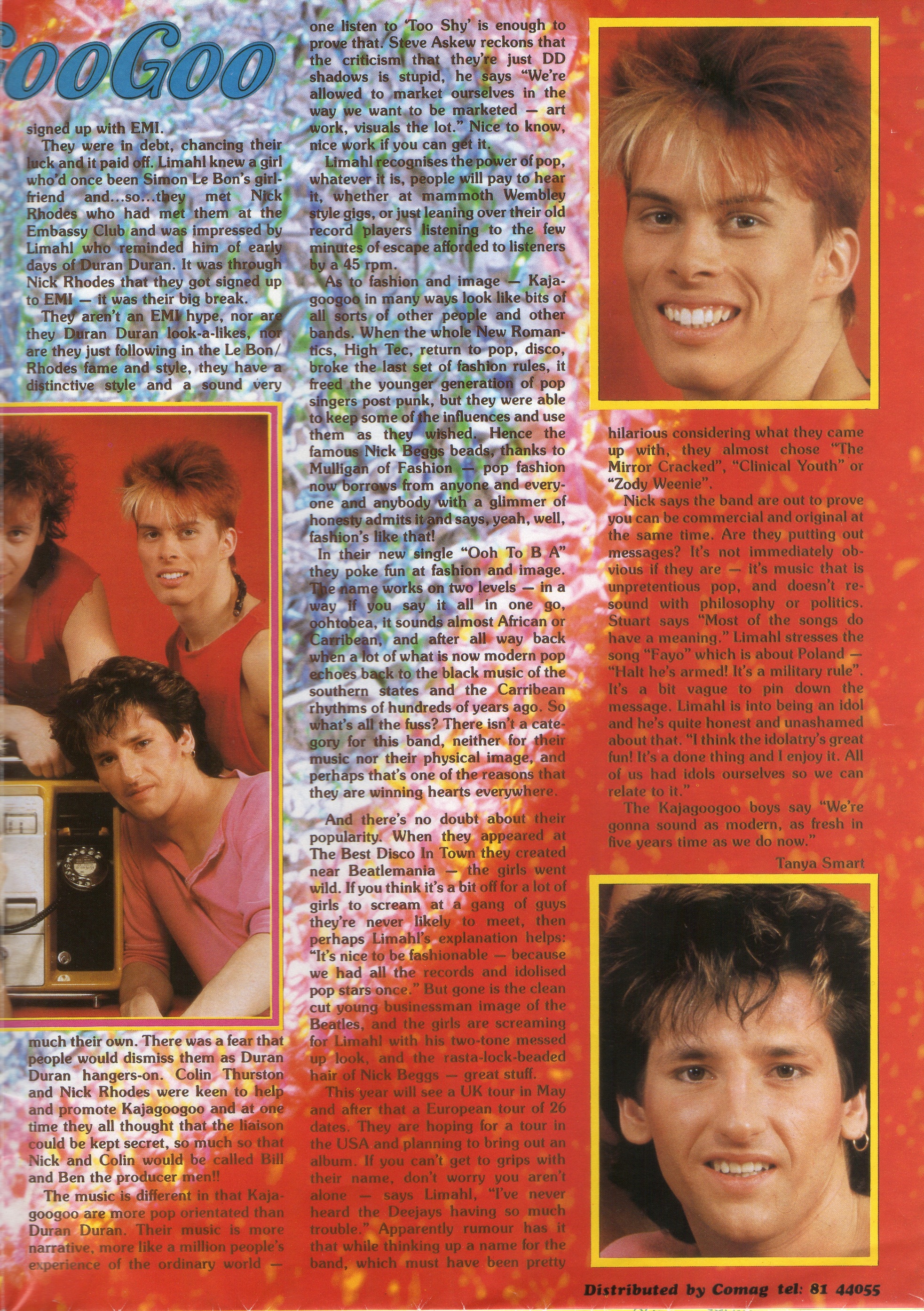 They aren’t an EMI hype, nor are they Duran Duran look-a-likes, nor are they just following in the Le Bon/Rhodes fame and style, they have a distinctive style and a sound very much their own. There was a fear that people would dismiss them as Duran Duran hangers on. Colin Thurston and Nick Rhodes were keen to help and promote Kajagoogoo and at one time they all thought that the liaison could be kept secret, so much so that Nick and Colin would be called Bill and Ben the producer men!!