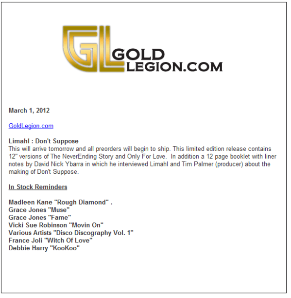 I haven’t got my CD either, and eventually after numerous emails and a somewhat blunt final attempt I got a reply from Greg but all it said was “It’s despatched”, no date when, no apology for the late reply, nothing of any use. I did get the Debbie Harry CD from them in November and that did arrive so I still have hope but it’s fading rapidly… I’ve made a claim against an American company before and got all my money back from my credit card, but I’m not so sure it will be valid after a two year wait – I’m going to try though, and go for eBay as well – assuming that the eBay seller isn’t just Gold Legion by an alias!