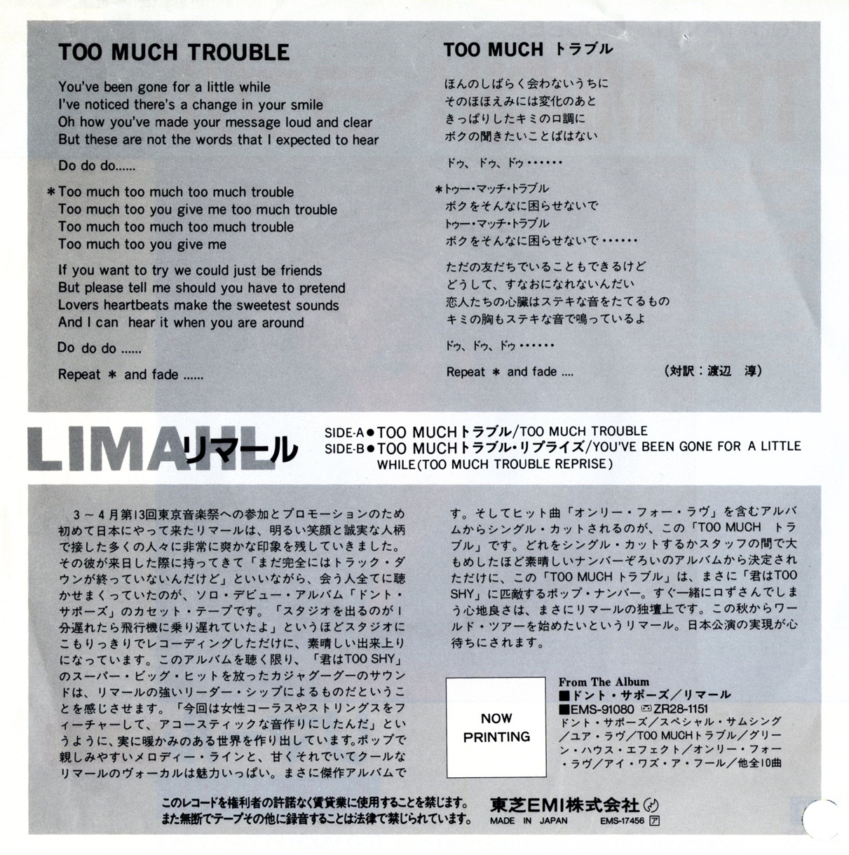 Kajagoogoo Japanese Collectors Series – 日本製 – Part 4 – ‘Too Much Trouble’ by Limahl