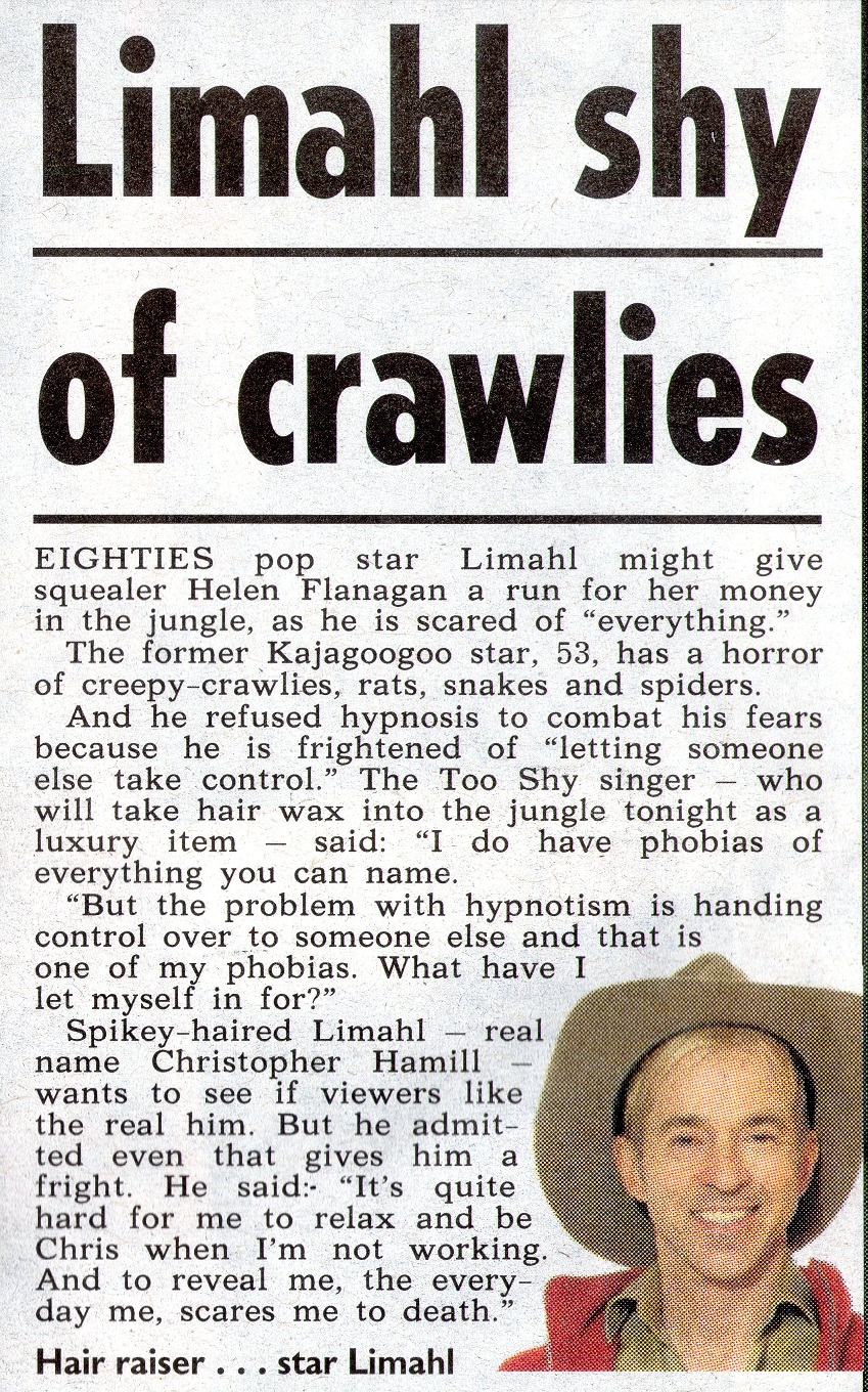 Limahl and fellow new entrant Rosemary Shrager had to endure a night billed as a sinister sleepover locked in the ‘Bushman’s Refuge’. Tea, coffee and biscuits were to be the reward….