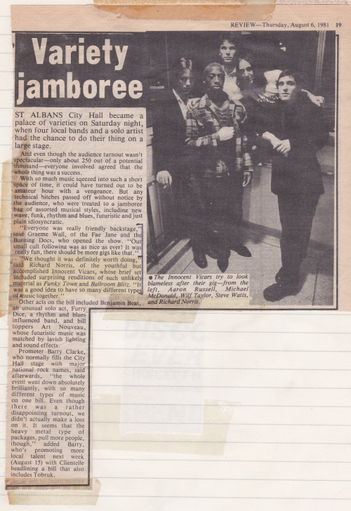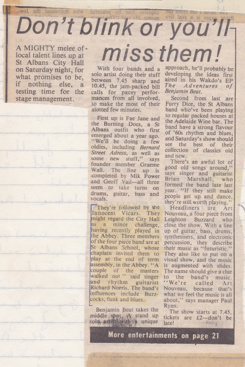 What we have for you now are some newspaper articles, scanned from Richard’s original cuttings from ’81. The first image is an advertisement for the event. The second is pre-event and contains a quote from Art Nouveau’s manager, Paul Ryan. The third is a review of the event.
